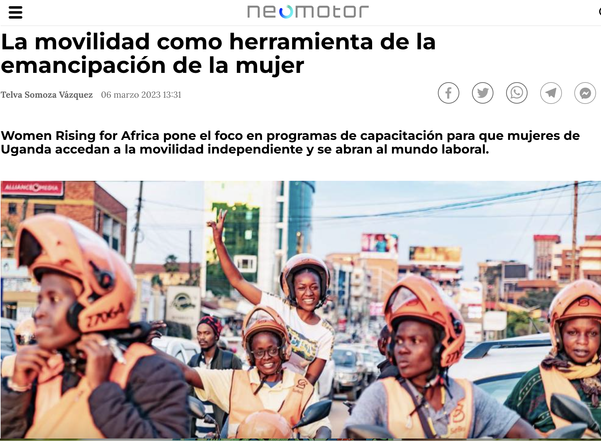 The article by Telva Somoza Vázquez in NeoMotor, published on March 6, 2023, highlights the importance of mobility as a tool for women’s emancipation in Uganda. Through Women Rising for Africa, the project aims to empower Ugandan women by providing them with training to access independent mobility and job opportunities. The program focuses on training women in driving skills, first aid, self-defense, and economic and financial literacy. Additionally, the success of the pilot project implemented between July and November 2022 is mentioned, with a success rate of 75%. The story of Dathive, a mother from Rwanda, highlights the positive impact of the program, demonstrating how mobility can transform lives and communities.
